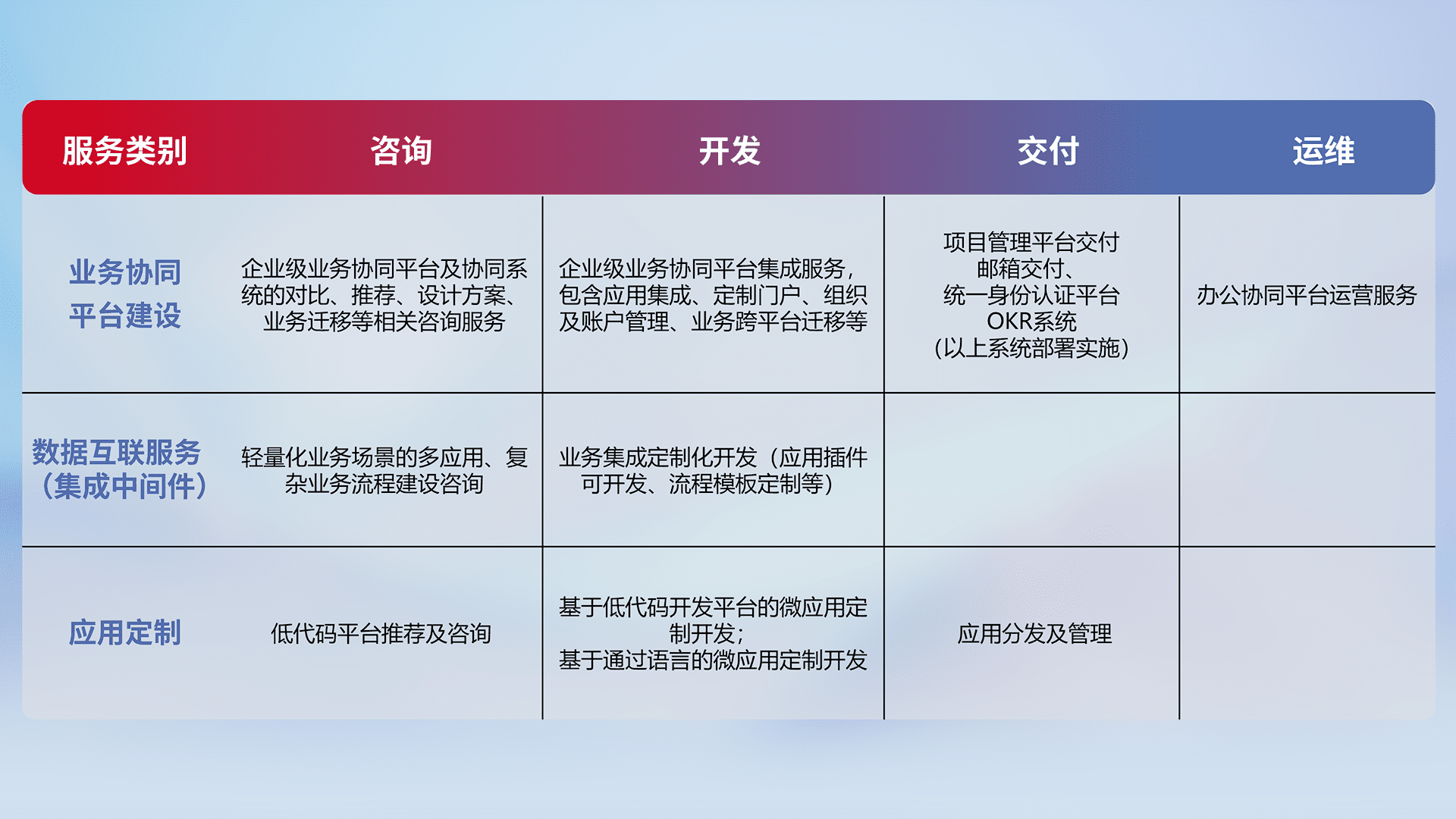 针对钉钉、、、企微、、、IDaas等平台级产品提供产品的规划、、、、方案、、、、交付、、、定制化开发等服务,,,,实现如统一协同办公、、、智能客户服务、、混合会议管理、、智能数据查询、、、等业务场景,,,实现数字化转型。。