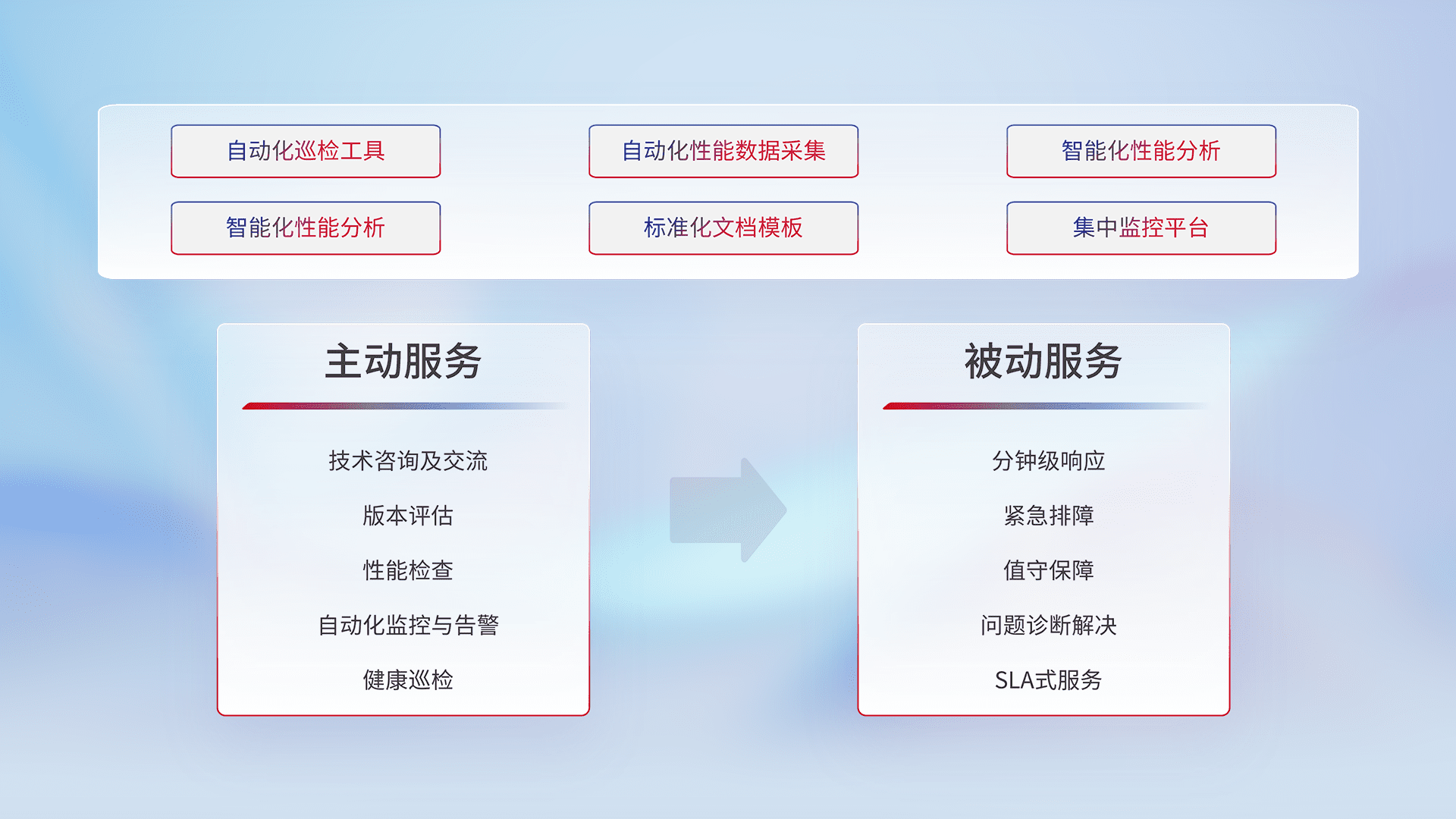 智能化工具和标准化文档,,,保障服务质量,,,,提供主动服务(包含技术咨询、、版本评估、、、性能检查、、、自动化监控与告警、、、健康巡检)和被动服务包含(分钟级响应、、、、紧急排障、、、值守保障、、、、问题诊断解决、、、、SLA服务)。。。。